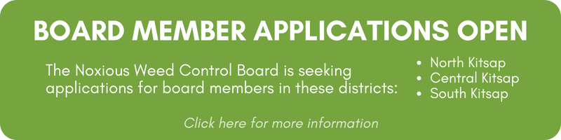 Kitsap County's Noxious Weed Control Board consists of five voting members appointed by the county Commissioners, and one non-voting member which is either the director, or appointed by the director of the county WSU extension office. Each voting member represents the geographic area of one of Kitsap County's five school districts, and serves a term of four years. The Noxious Weed Control Board is required to hold a public meeting at least quarterly with a quorum - a majority of voting members present. The Board works closely with the Program Coordinator to provide education and technical assistance in the control of noxious weeds.